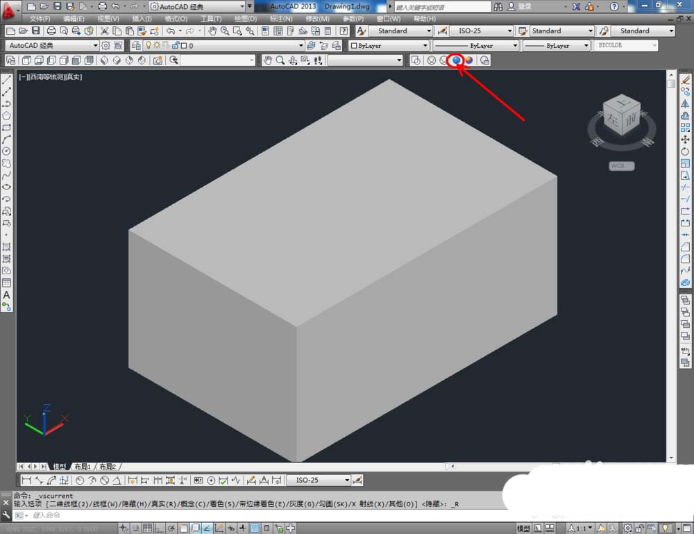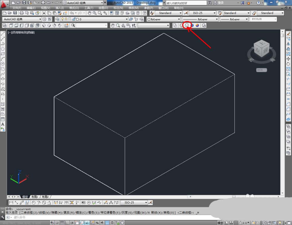 3、鼠标依次点击视觉样式中的【线框】、【隐藏】、【真实】、【概念】图标,可绘制出各种视觉样式的长方体模型(如图所示);