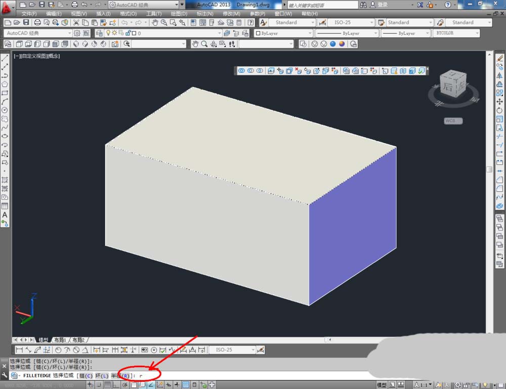 5、通过【实体编辑】工具,我们可以对长方体模型进行进一步编辑制作。我们以圆角边为例,点击【圆角边】鼠标选中需要圆角处理的边线后,在命令栏输入:r,并按下空格键,输入数量:50,完成选边的圆角处理。这样我们用cad绘制的长方体就制作完成了。