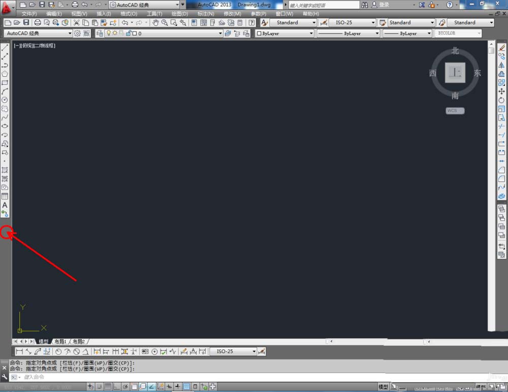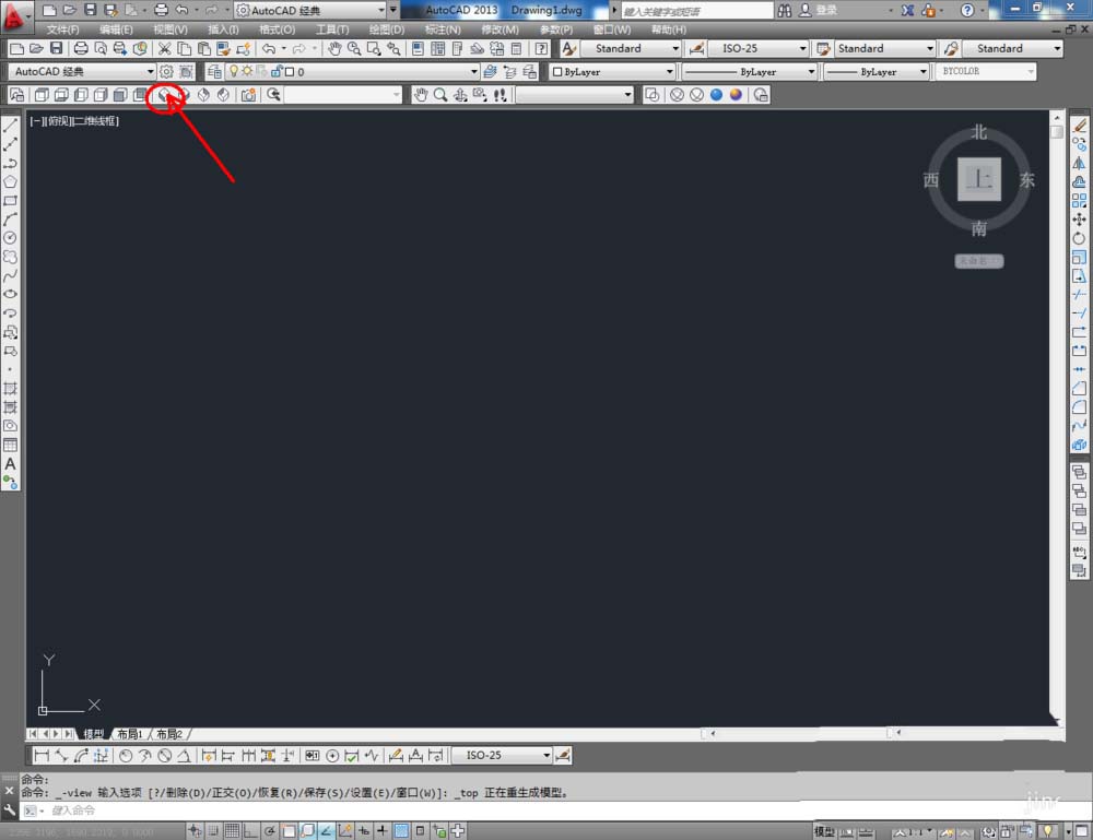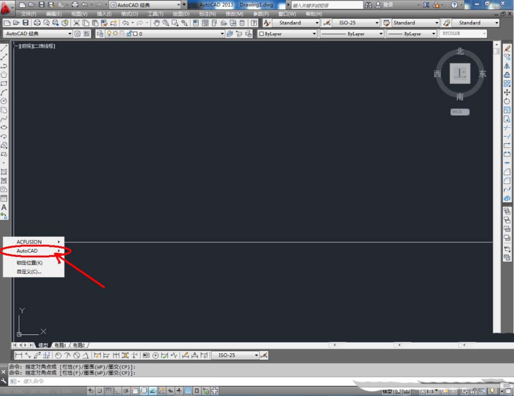 1、打开AutoCAD 2013软件,鼠标移动到图示区域,点击鼠标右键-【AutoCAD】,勾选【视图】、【视觉样式】和【三维导航】,将这三个工具栏调出并按图示调整好工具栏的位置;