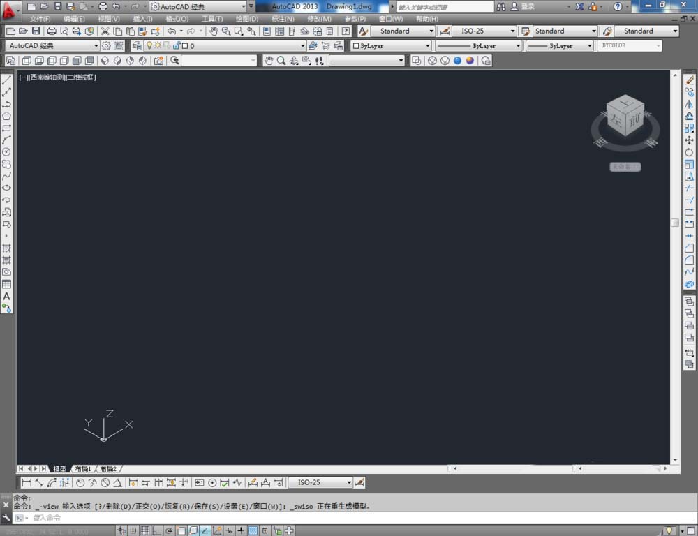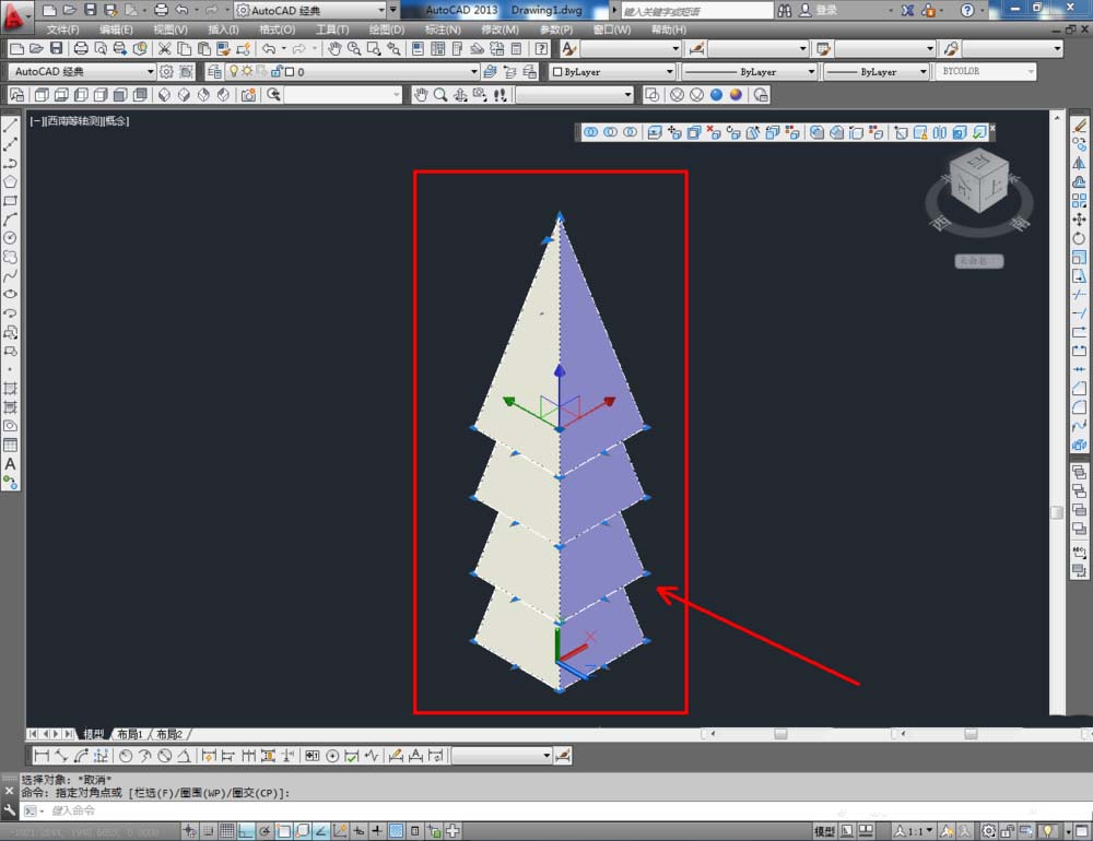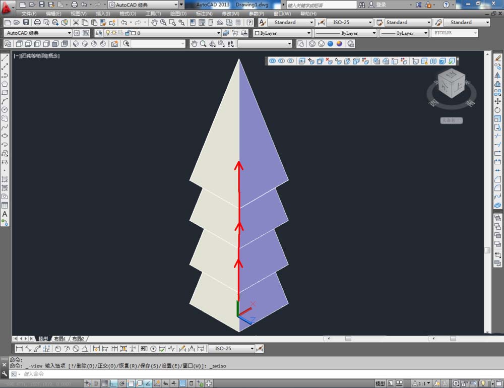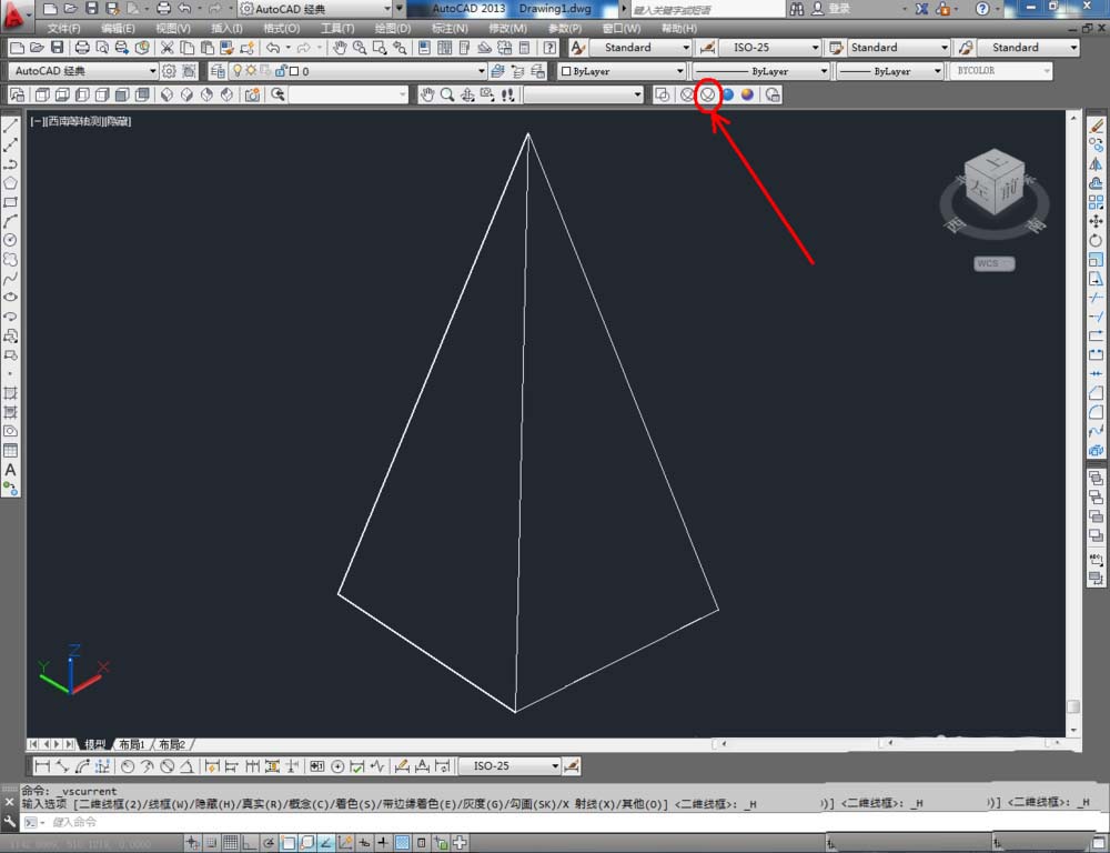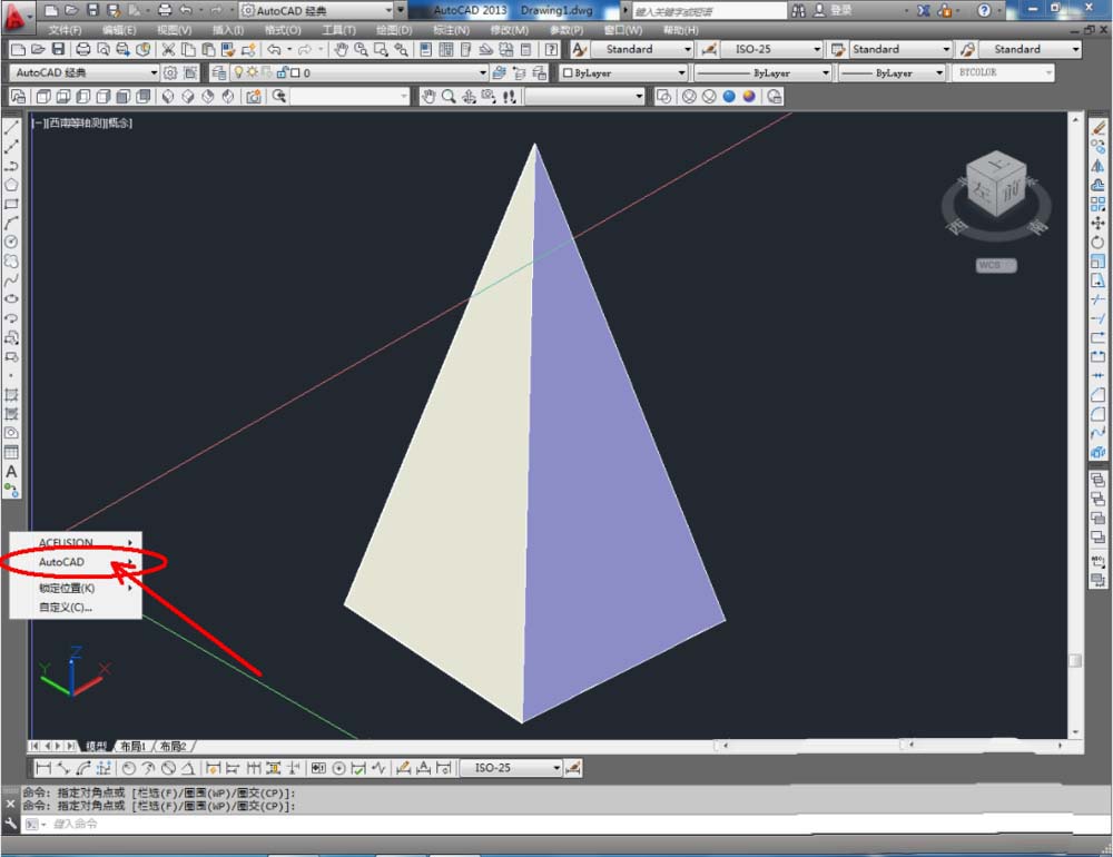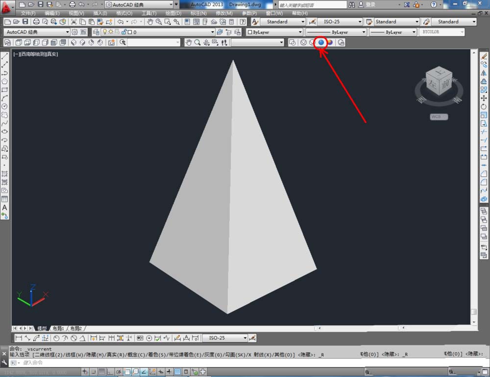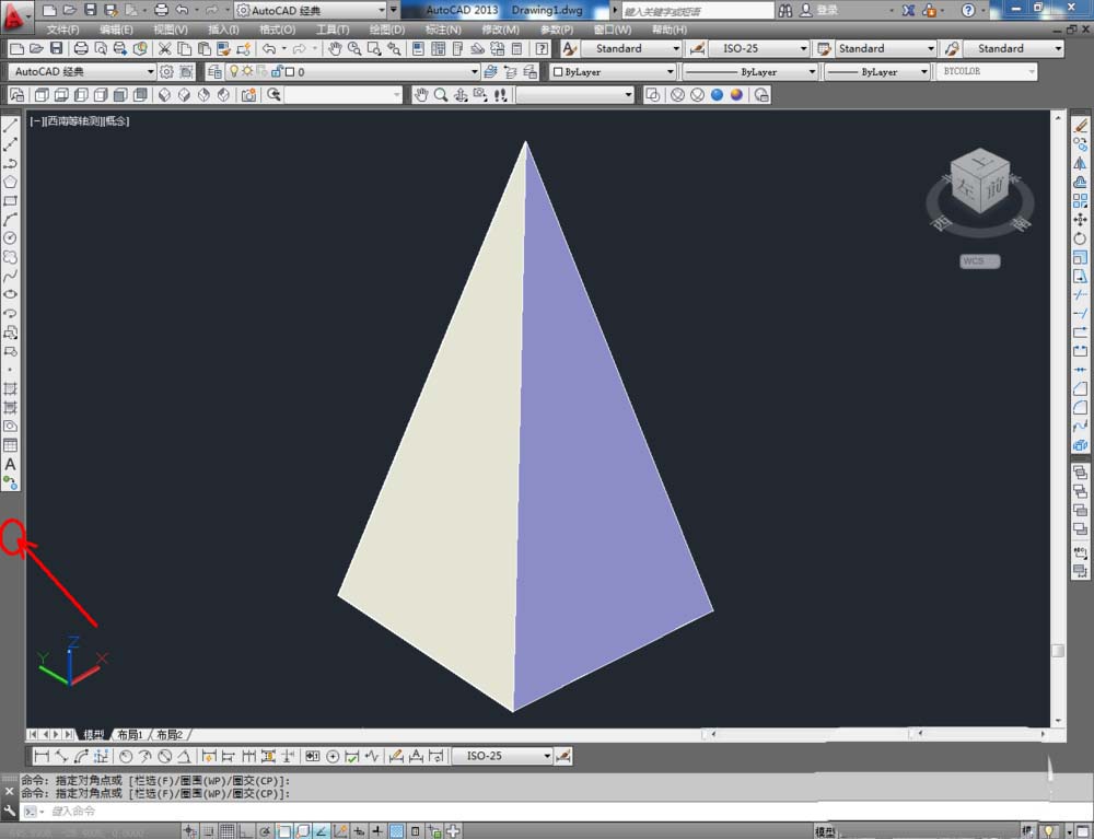 2、点击视图栏中的【西南等轴测】将视图切换为西南视角后,点击【绘图】-【建模】-【棱锥体】,按图示在作图区域绘制一个棱锥体模型(如图所示);