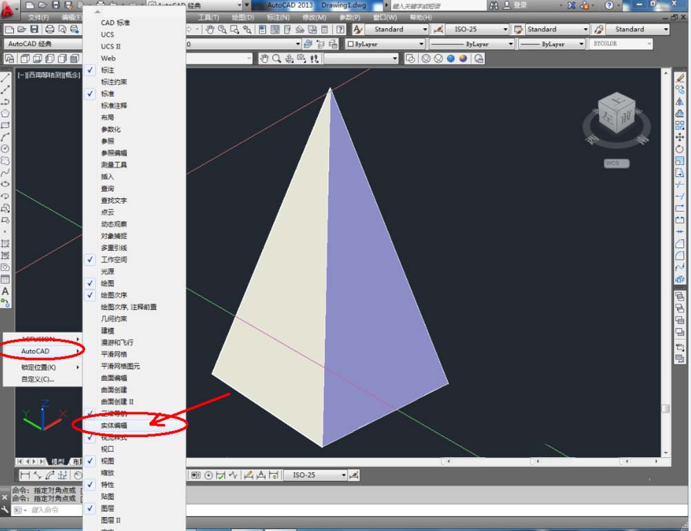 4、点击【受约束的动态观察】,通过旋转观察棱锥体的各个视角。点击鼠标右键-【AutoCAD】,勾选【实体编辑】将实体编辑工具栏调出(如图所示);