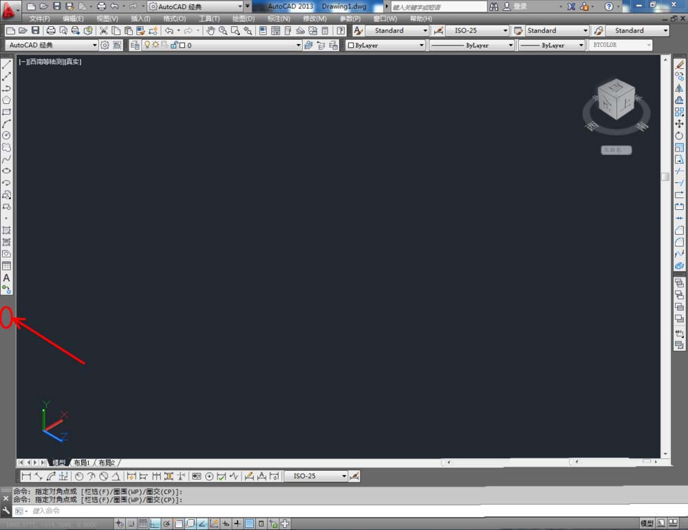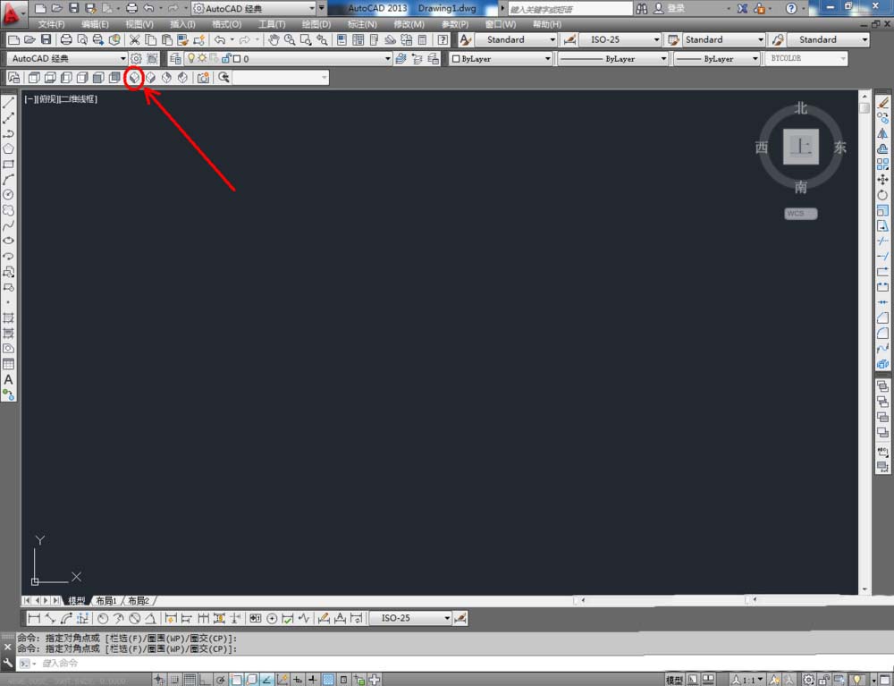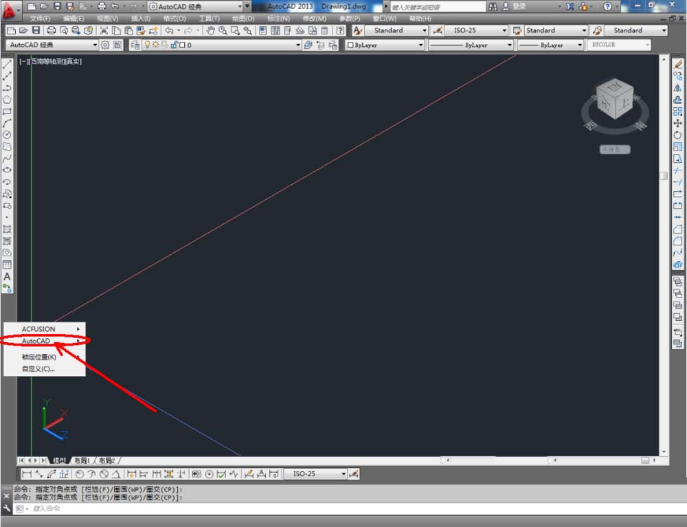 1、打开AutoCAD 2013软件,鼠标移动到图示区域,点击鼠标右键-【AutoCAD】,勾选【视图】,将视图工具调出到作图界面并按图示调整好工具栏的位置;