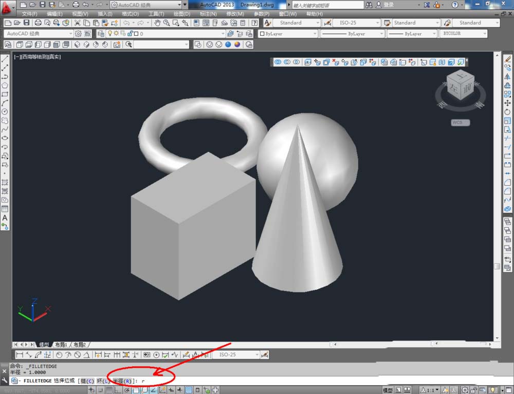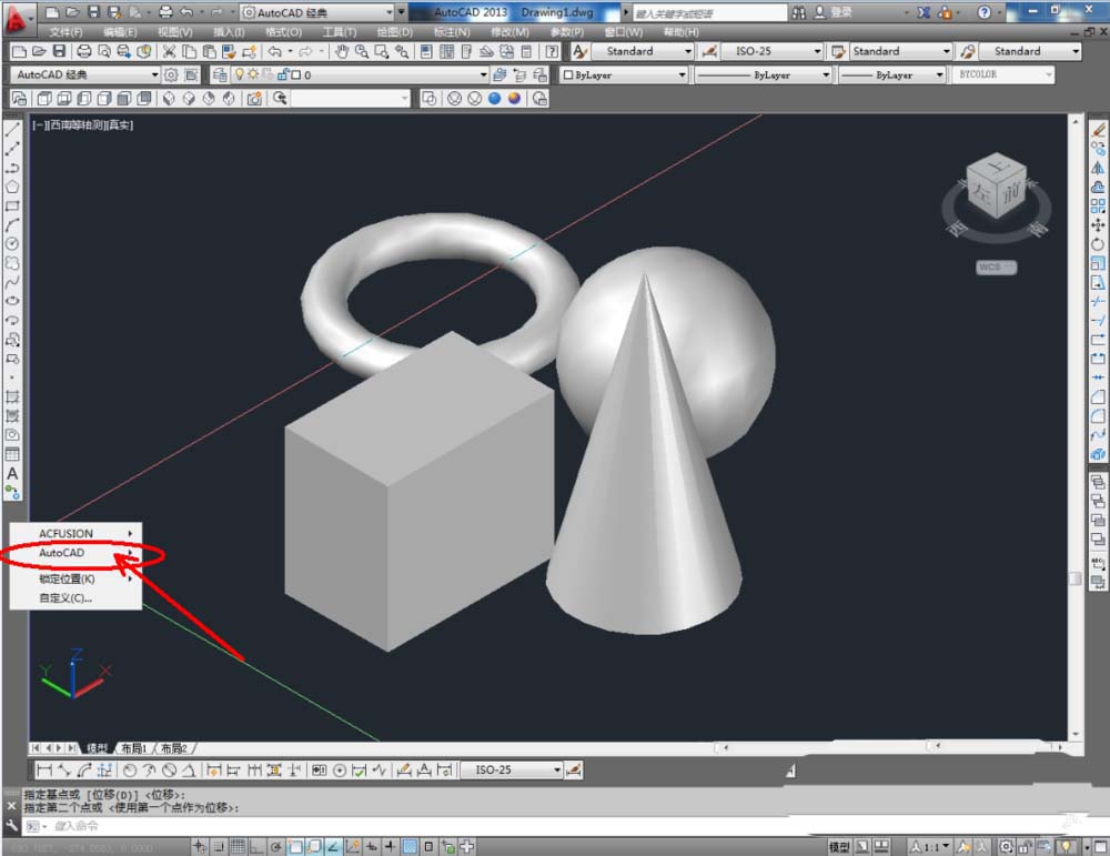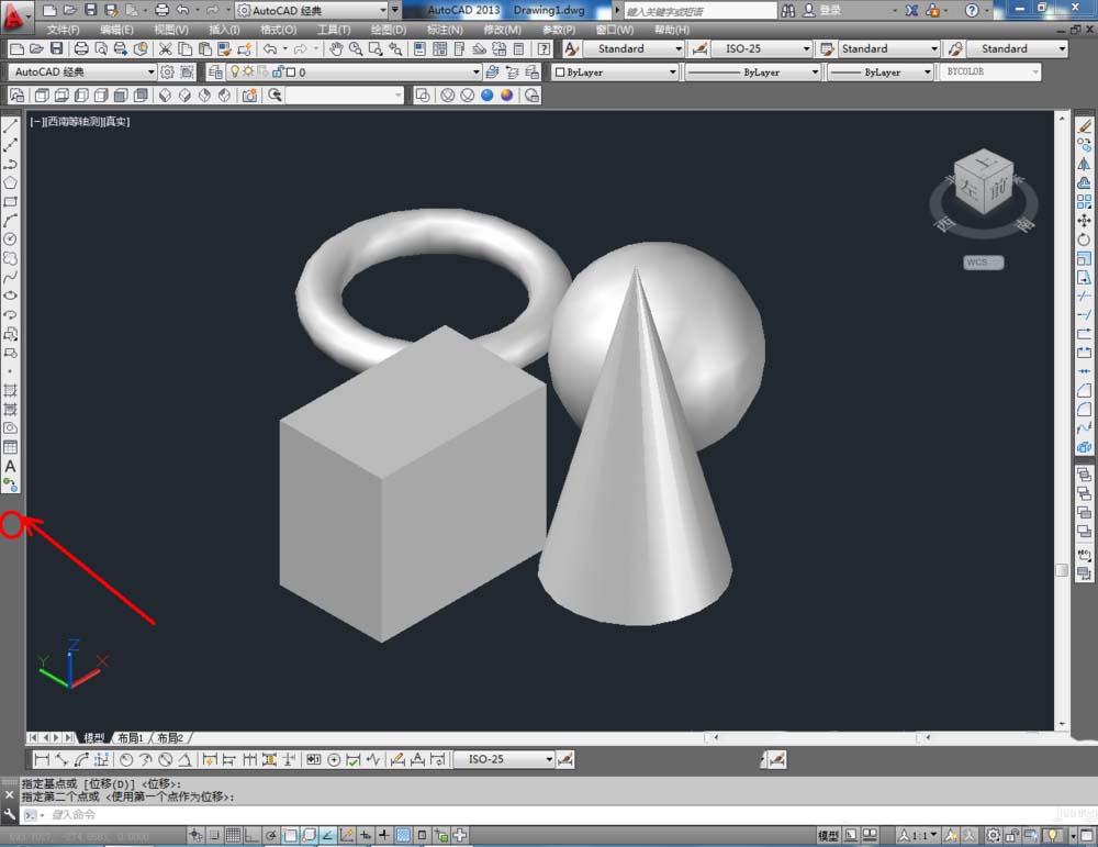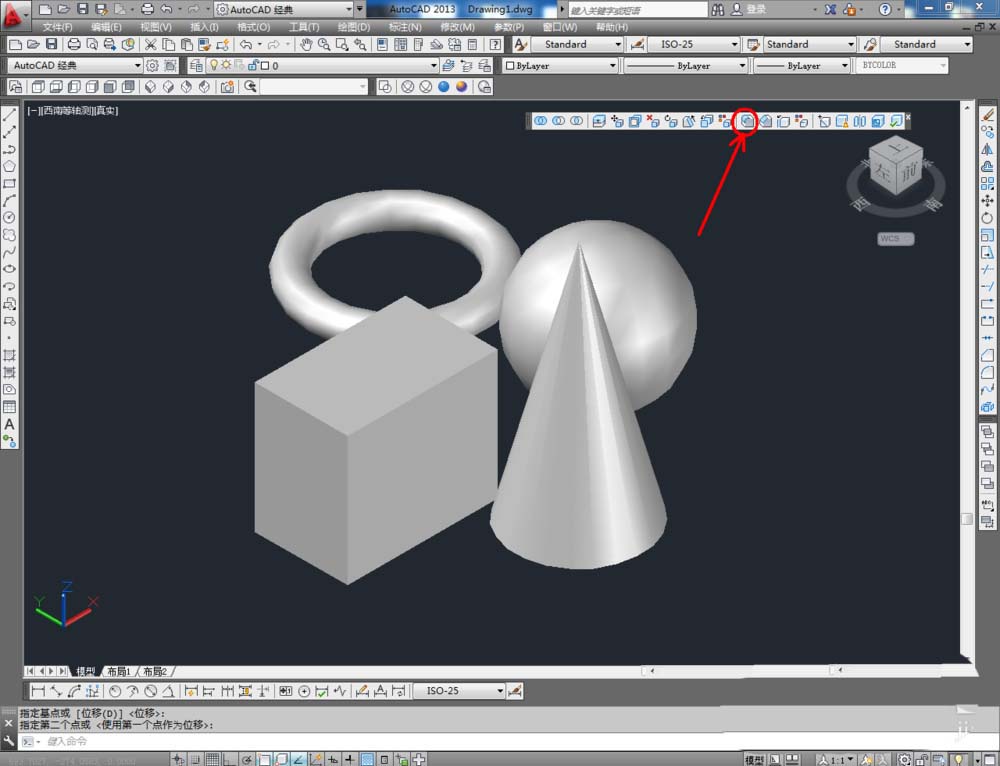 2、点击【西南等轴测】,将作图界面切换为西南视图界面。点击【绘图】-【建模】,点击【长方体】、【圆锥体】、【圆环】、【球体】依次制作出几个模型基本体(如图所示);