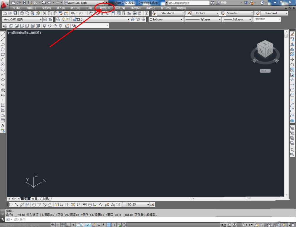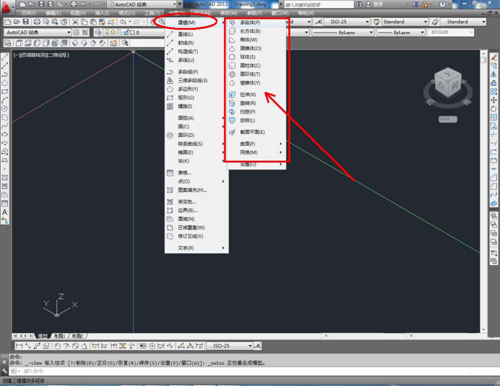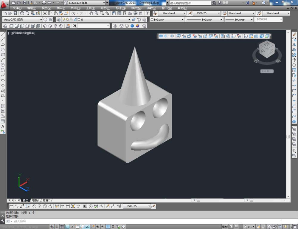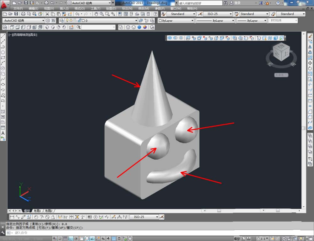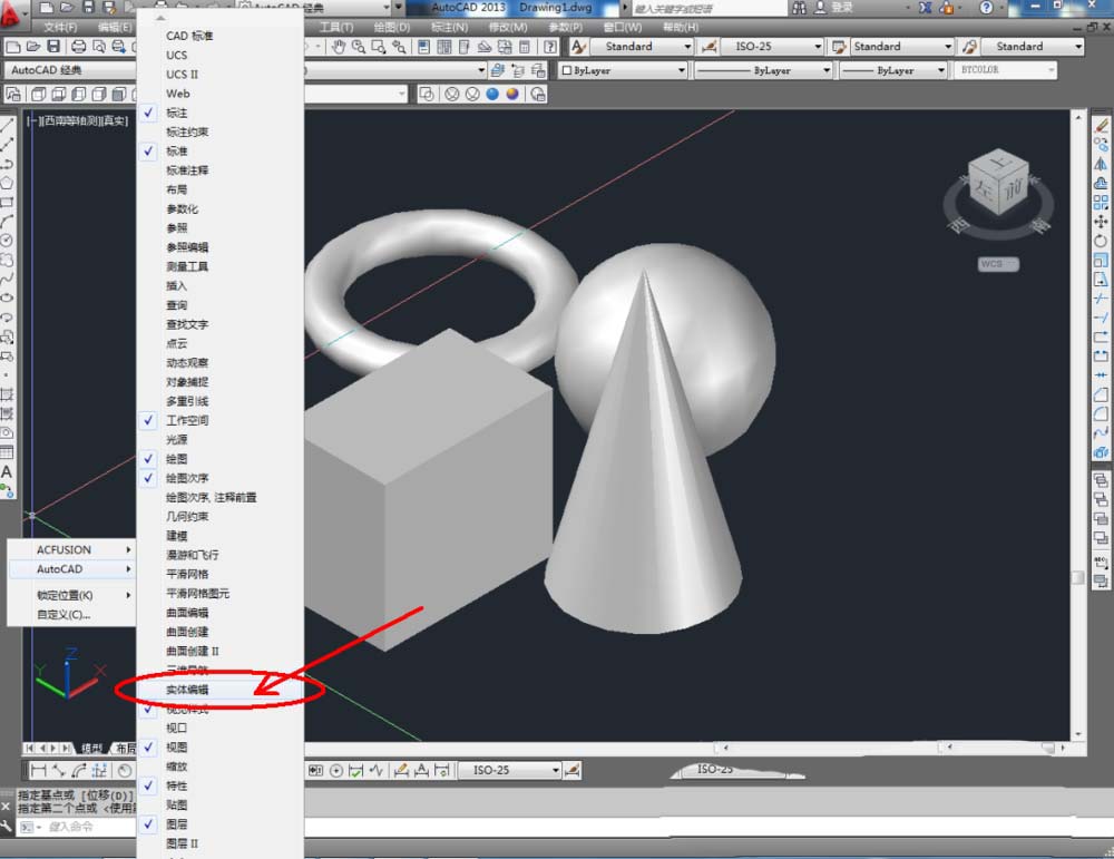 2、点击【西南等轴测】,将作图界面切换为西南视图界面。点击【绘图】-【建模】,点击【长方体】、【圆锥体】、【圆环】、【球体】依次制作出几个模型基本体(如图所示);