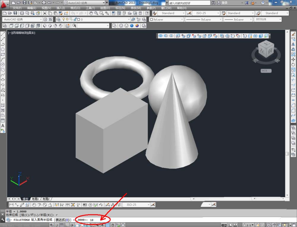 4、点击实体编辑中的【圆角】工具,在命令栏中输入:r并将圆角半径设置为:10后,选中图示模型上的边进行圆角处理(如图所示);