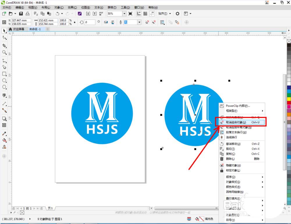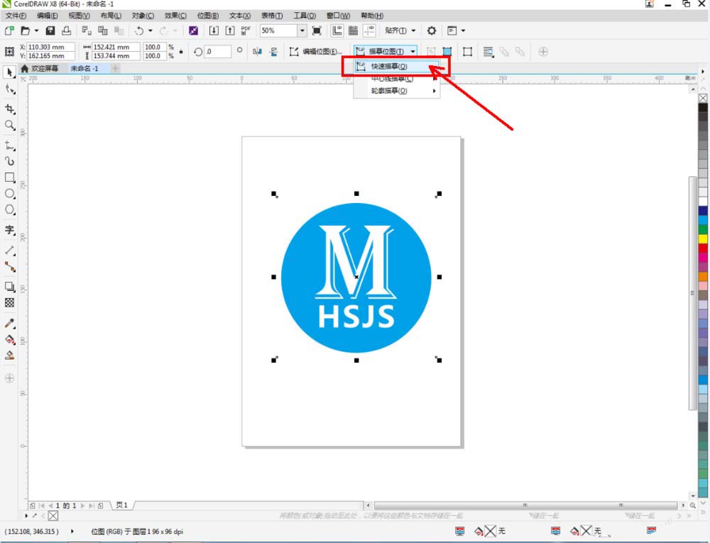 3、选中图片,点击【快速描摹】,描摹好一个logo图案后将其移动与原图分开。点击鼠标右键-【取消组合对象】后,将白色背景以及原logo图片删除;