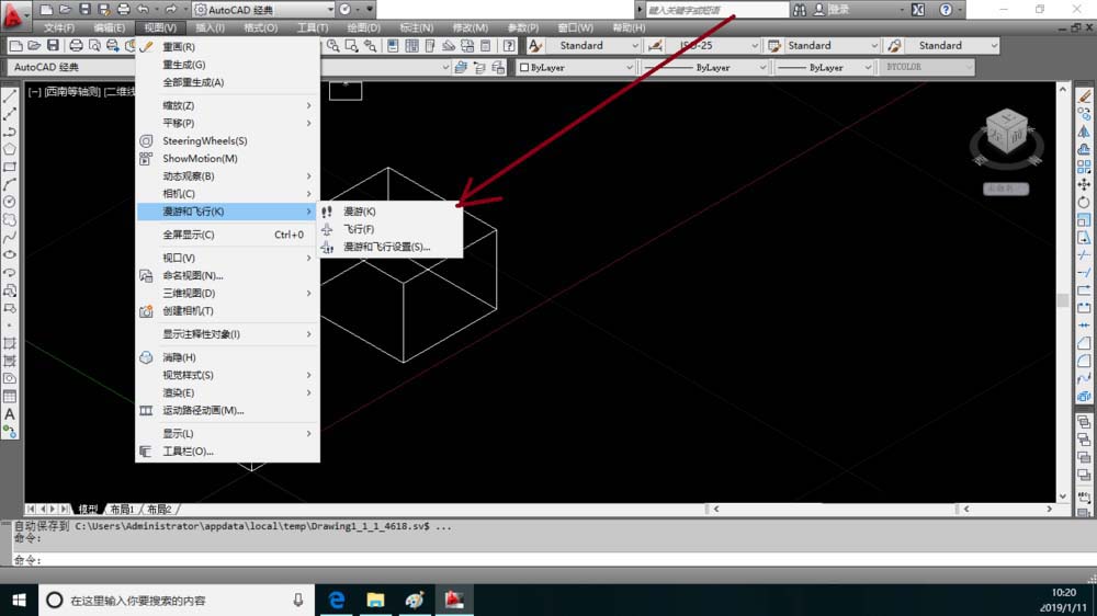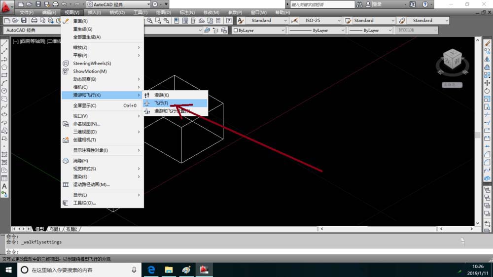 7、再点击视图选项卡弹出下列菜单中选择漫游与飞行选项中的菜单点击(飞行或漫游)命令,在这选择飞行。