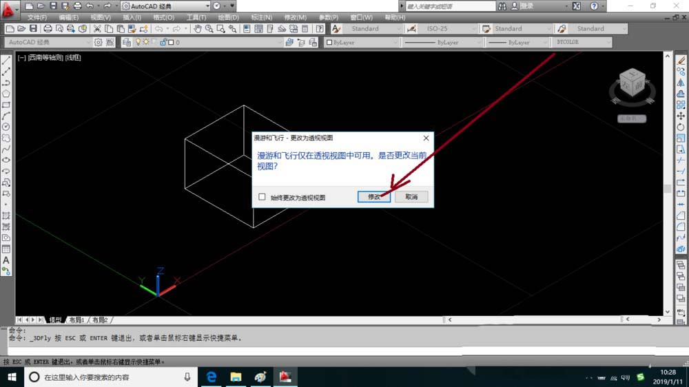 8、然后弹出漫游与飞行:更改为透视视图对话框,在这对话框中直接点击修改按钮。