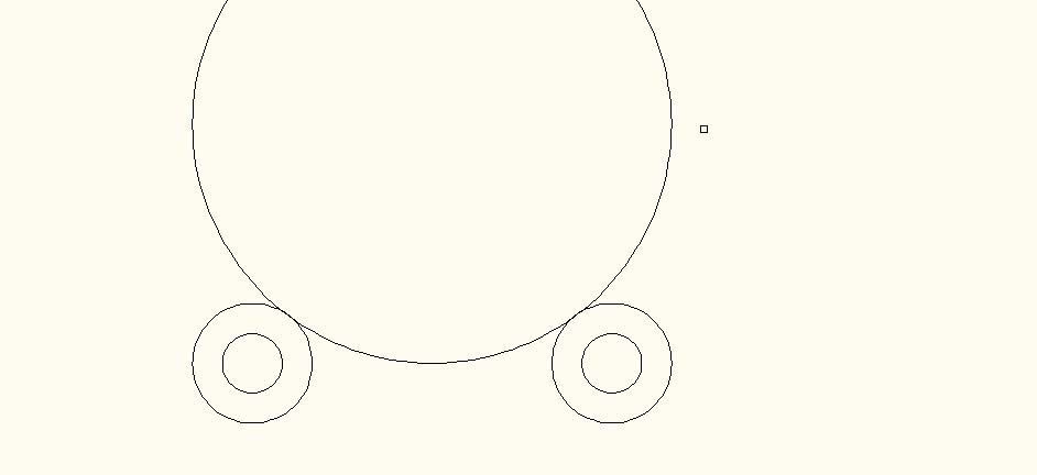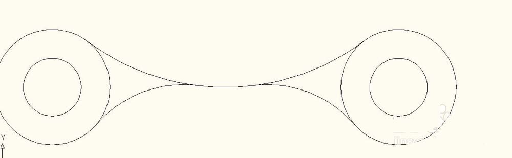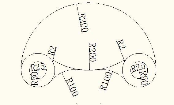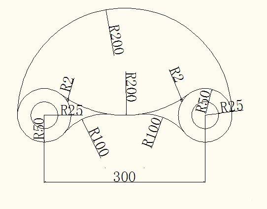 4、然后同样用相切相切画圆,半径100,相切点为左边圆下半部分和半径200的圆弧点上,并镜像修剪后可得