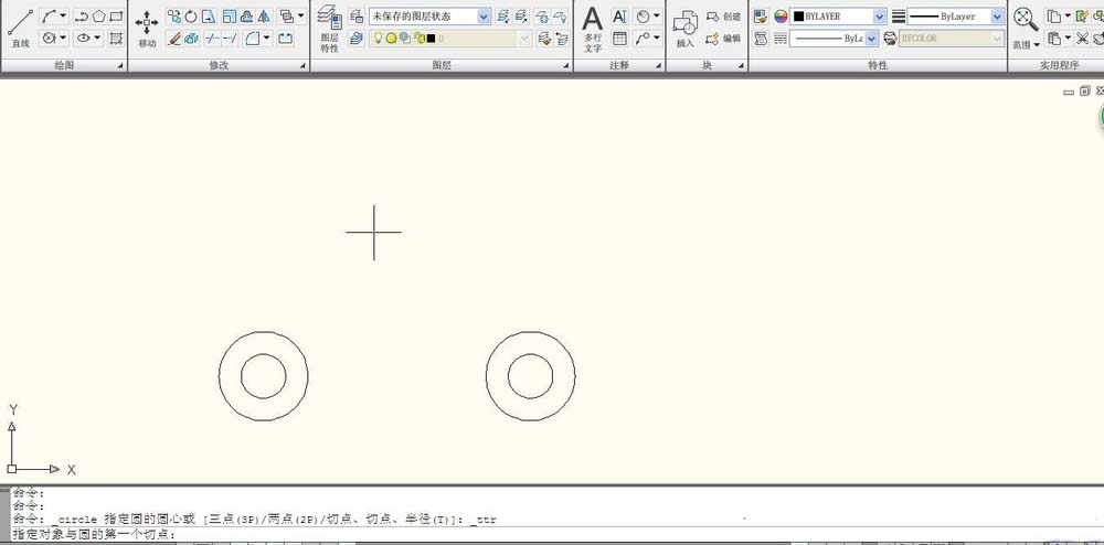 1、先画一个半径五十里面二十五的圆然后向右偏移30。