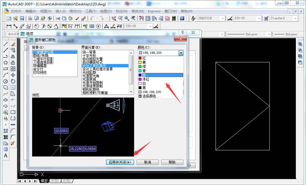 6、然后我们点击图示的位置选择好设计工具栏提示的颜色再点击应用并关闭后cad二维模型空间设计工具栏提示的颜色就设置完成了,如图所示;