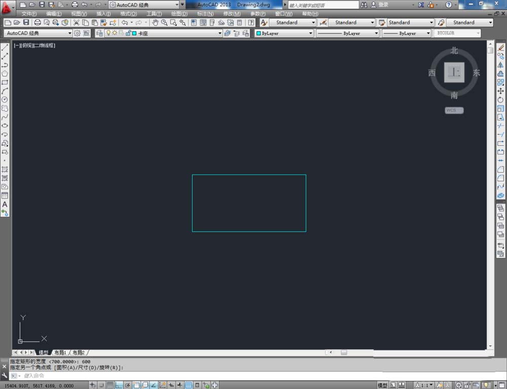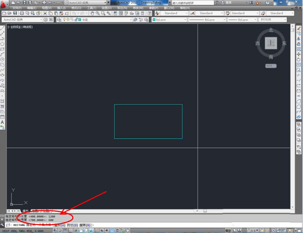 2、点击【矩形工具】,按图示在命令栏输入:1200和600两个数值,绘制出一个1200*600mm的矩形图案。在命令栏输入:400和700两个数值,绘制出一个400*700mm的矩形图案,并调整好两个图案之间的位置(如图所示);