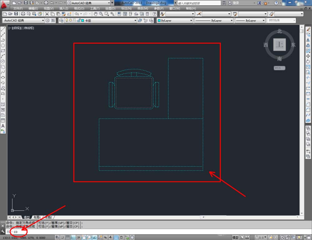 4、导入我们制作好的办公椅子图块,调整好办公椅与卡座之间的位置关系。选中两个图块,在命令栏输入:co并按下空格键,移动复制出另外两组卡座副本(如图所示);