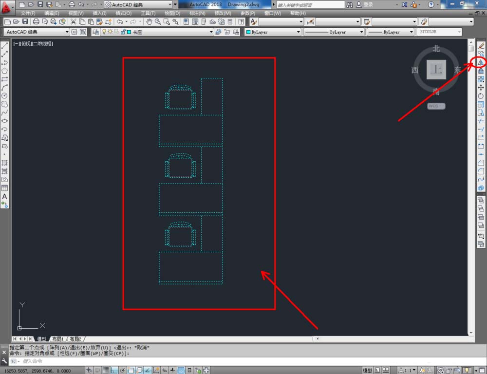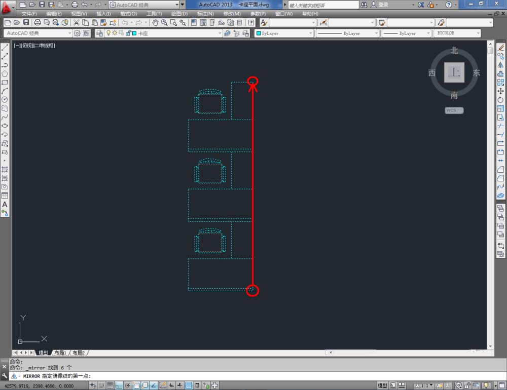 5、选中三组卡座图块,点击右边工具栏中的【镜像】,按图示拉动镜像复制出另外三组卡座图块,这样我们整个卡座平面图便绘制完成。