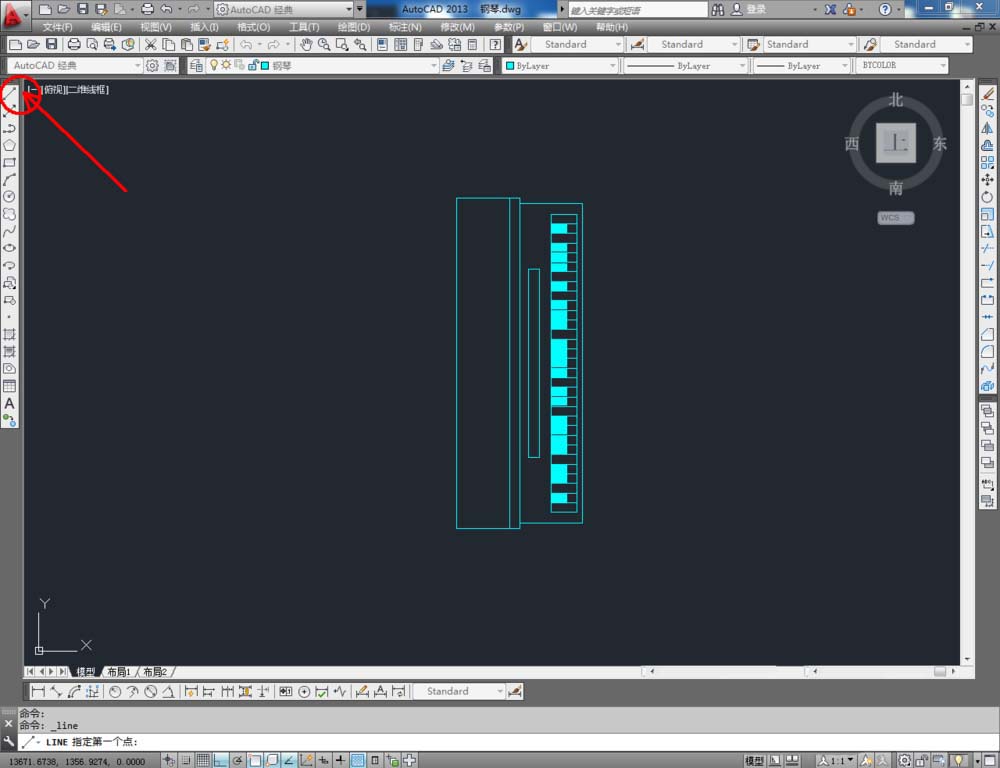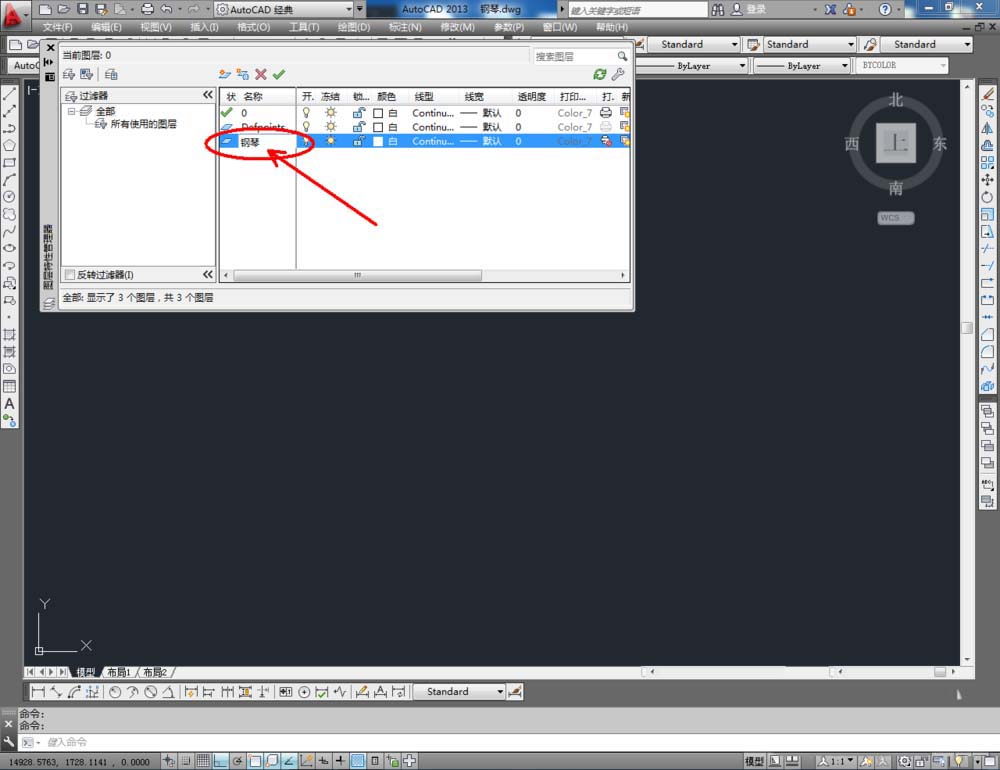 1、打开AutoCAD 2013软件,点击【图层特性管理器】,点击【新建图层】,将图层命名为:钢琴。点击色块,按图示设置一个图层颜色,完成钢琴图层的设置(如图所示);