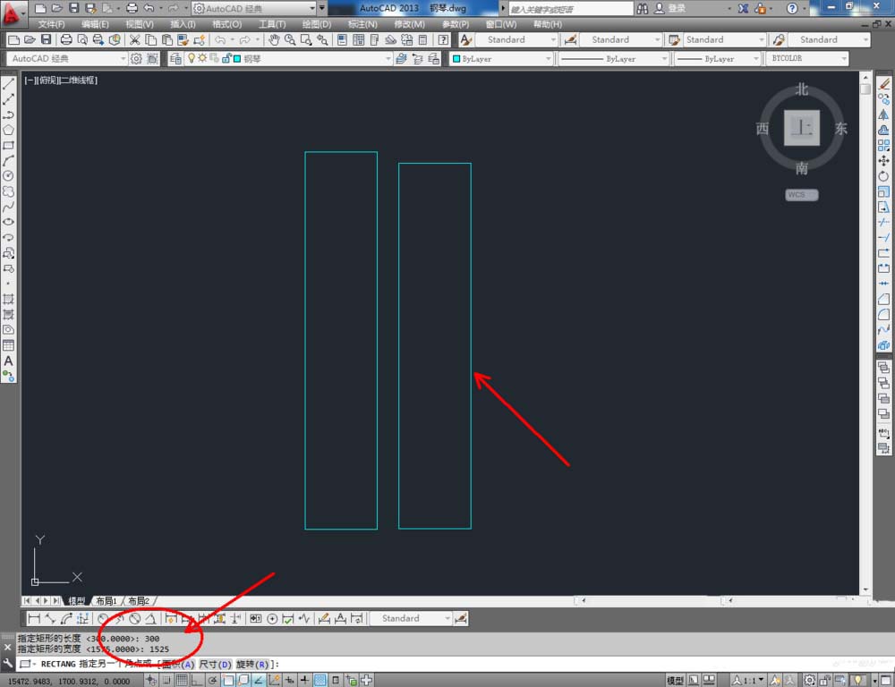 2、点击【矩形工具】,按图示在命令栏输入:300和1575两个数值,绘制出一个300*1575mm的矩形图案。在命令栏输入:300和1525两个数值,绘制出一个300*1525mm的矩形图案,并调整好两个图案之间的位置。点击【直线工具】在钢琴盖部位绘制一条线段(如图所示);