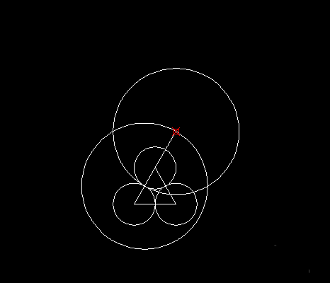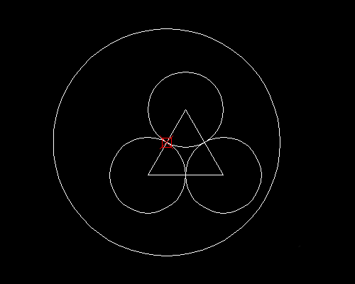 3、延长三角形的边至于大圆相交,以交点为圆心,画等径大圆,与两小圆相切。这里可以看出,大小圆半径为3倍关系。