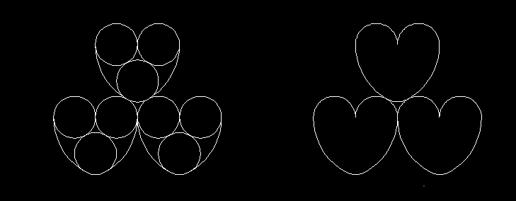 6、以小圆圆心为基准,复制上面的心形雏形图至下面左右两个小圆。裁剪多余的线条,即可得到三个心形线状图。