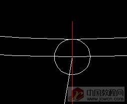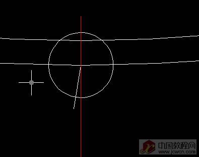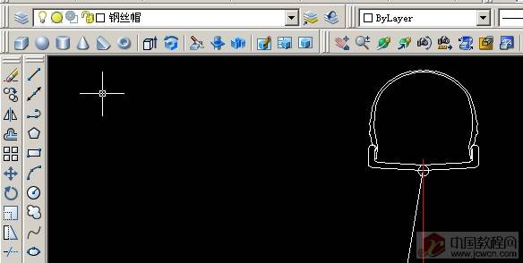 切换到钢丝帽层画图,沿上步斜线画一段线,长度自定,再画一个圆,这个圆比上步圆稍大即可!同样,旋转圆与线相垂