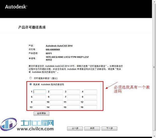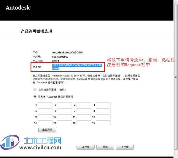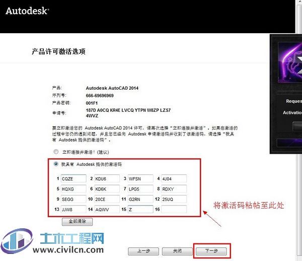 最后复制Activation中的激活码至“输入激活码”栏中,并点击下一步完成激活。这样就完成了Autodesk产品的注册了