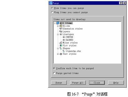 命令行:purge(或别名pu)调用该命令后,AutoCAD弹出"Purge(清理)"对话框,如图16-7所示。