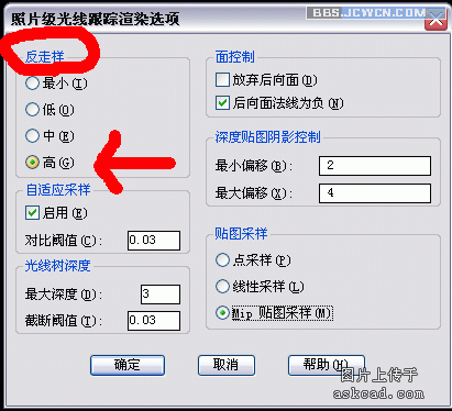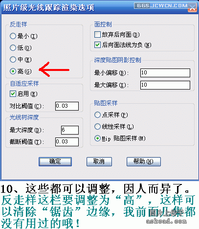 答:这不是"反走样"出了问题,而是通常和自己的显示器有关了,如果渲染的图片通常较大(一般为1024*768),通常相当多的论坛上显示出来的图片是限制了一定范围的,所以看起来仍有"锯齿状"。解决办法是,把这个图片单独点击打开,适度放大些看,就没有问题了。还有办法是缩小图片,这样同样清晰了,但是图片很小,一般不这样做。
