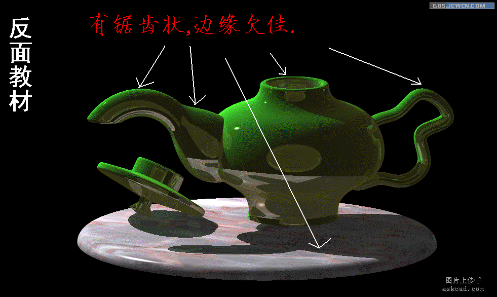 答:这种现象叫"走样",要消除则用把渲染中的"渲染选项"中把"反走样"设置为最高,则可以消除。我在前几集中的渲染图片,都没有用这个,因为这样让电脑运转的更加慢了,为了提高渲染图质量,还是要设置高些。