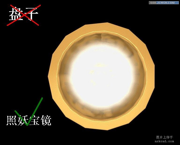 答:经验是因人而异的,没有固定的说法。比如说,在上集中我对一个盘子渲染时,当在俯视图中渲染中,盘子中间的图案全部看不见,而是白花花的一片。这种现象让我始料未及,想了想造成的原因是灯光正好设置在正上方了,而又太强,所以致此。按理说,从盘子角度而言,这是失败的!但是为什么不换个思维来考虑呢?假如我画个"照妖宝镜"之类的东西,这个不就是灵感来源吗?如果没有这种失败的经历,要想画出"照妖宝镜"一类有些神话之类的东西,我恐怕想不到用这样的方法。