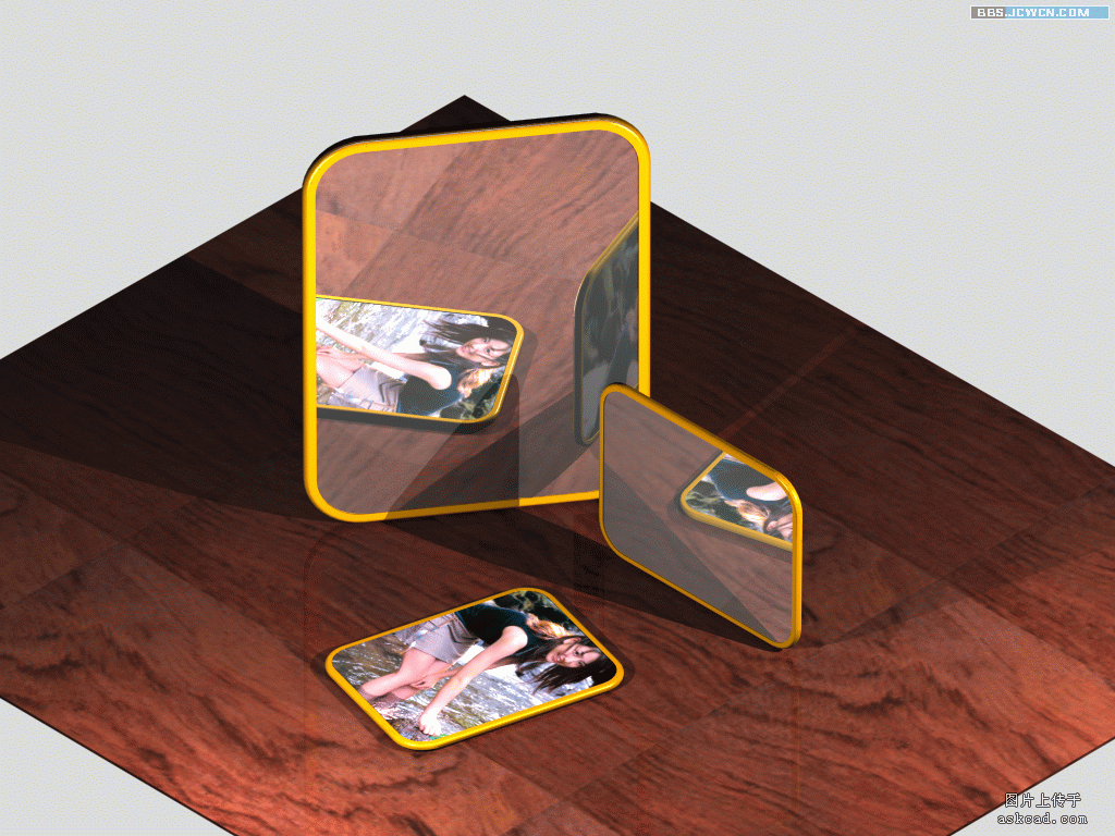 先从技术层面分析,画镜子的三维实体,实在太过简单,相信没有做不出来的朋友吧!我也懒得说画法了,此例中的镜子由三部分组成,镜框、镜片(玻璃总分)、镜底(实体同镜片一样,供贴图用)。
