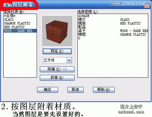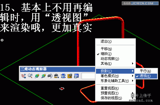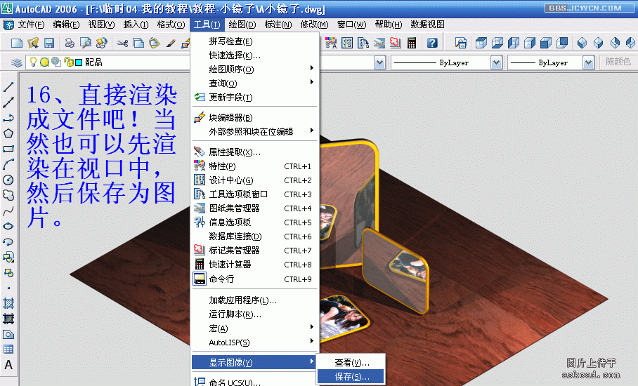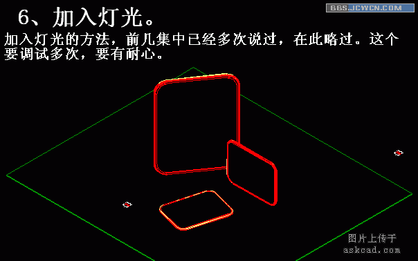 我把源文件与配图上传上来,自己可以看看。顺便要说两点,打开dwg文件后,感觉许多命令用不起,这是因为保存时的状态是"透视图",用平行视图就可以正常操作了。另一个问题上集已经说了,渲染结果是没有配图的,这是因为cad只是保留图片的路径,所以要自己重新加入图片的路径。