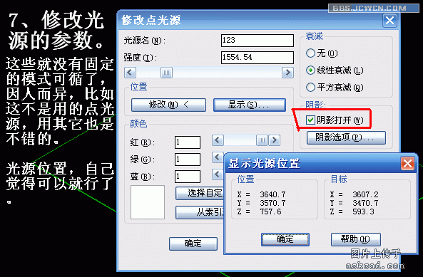 16、打开阴影,用"光线跟踪渲染"检查结果,这时就相当耗时了,可在"子样例"中设置"3:1"简略看看结果。