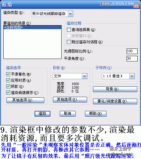 渲染主要的步骤,常规的大体上就是这些,但不要认为就这么几样东西,知道了就算学完了,这种想法相当错误。简单的东西,反复运用,就是产生很多新东西出来,比如就材质这一项,cad2006提供的现成材质有150多种,仔细一想,能依此做出来的新材质则是无限的。