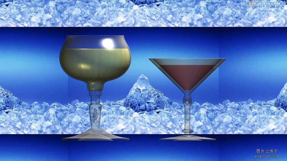 我举的例子都是相当容易做的哦,这样的杯子画时是相当容易的,我是凭想象画的杯子,至于实际上是否如此,不管这些了。创始面域实体旋转一圈可得,杯中的酒也是实体。难点是渲染中的调试过程,本来还要继续调试的,因为我用的这台电脑配置问题,渲染得非常耗时,等待时间较长,调试几次后就此打住。