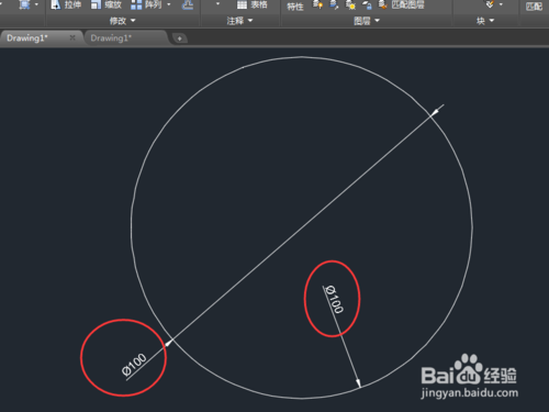 3、直径标注完成后,尺寸数值放在圆形外与圆形内是有区别的,请观查下图;