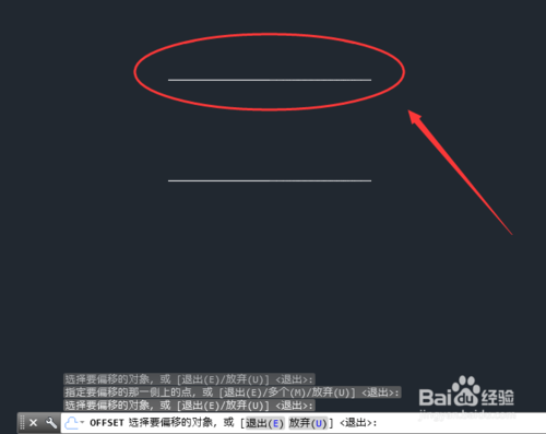 使用曲线偏移命令复制出第二条水平直线;(偏移快捷键是:O,在命令行键入O即进入偏移命令,输入其数值,然后点要偏移的一则即可)