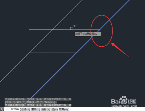 图上有一个角没有封闭,此时可以使用EX(延伸),对没有封闭的开口部分,给封闭;使用延伸时,先选要延伸到的边,然后再点需要延伸的线;