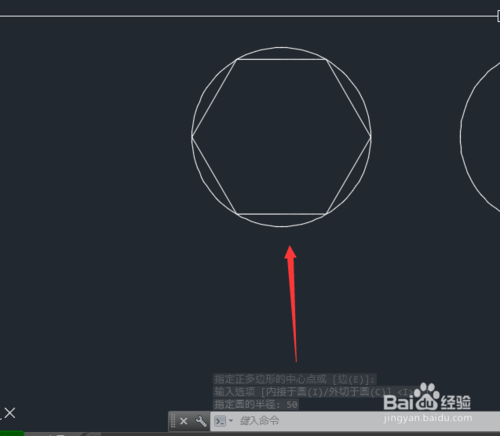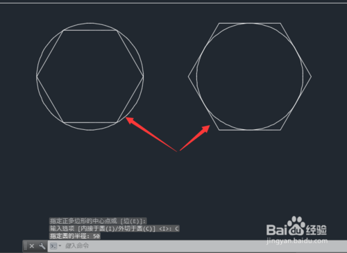 6、无论是内切六边形还是外切六边形,其绘图的过程是一样的,只是在选择内外切时才有区分,本次输入外切圆,通过以下两图,就清晰地绘制出内、外切六边形了;(下图中,左侧为内切圆,右侧为外切圆)