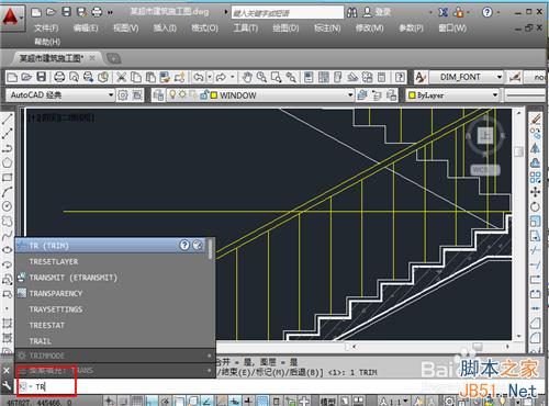 1、这个方式主要是使用围栏的方式,将不需要的对象围起来,修剪掉。在命令栏输入“tr”,快速点击两次“回车”键。