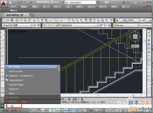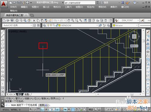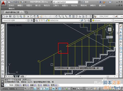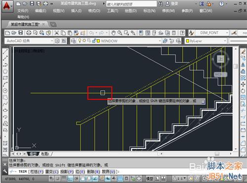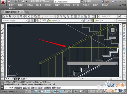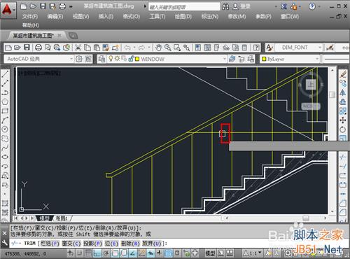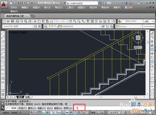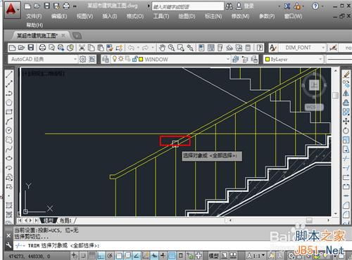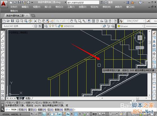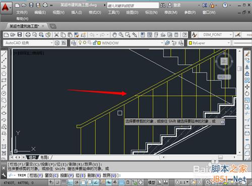 2、这时候要求选择对象,作为修剪的边界,就像选择作为 剪刀,去修剪别的对象。选择需要作为修剪边界的对象,如这里的楼梯扶手,点击它。