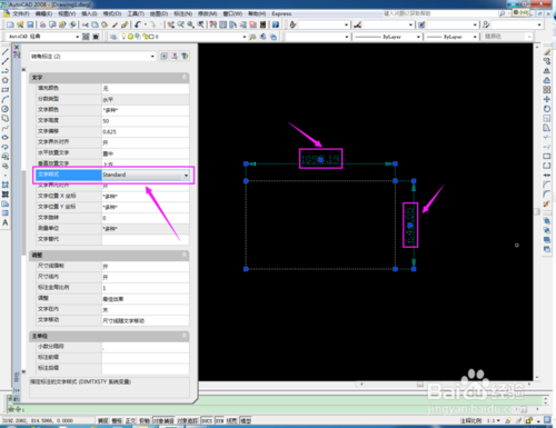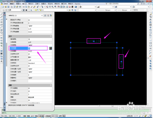 3、在“对象特性”窗口中,向下拖拉滚动条找到“文字”项,在“文字高度”参数处,将参数变大,点击回车键,绘图区标注文字的大小会随之变化,可以多次修改直到标注文字大小合适。