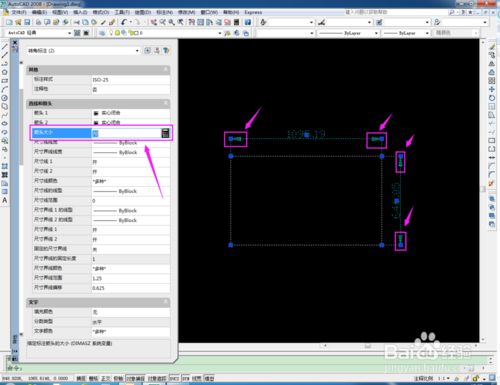 4、也可以同时将标注的箭头改成合适大小,方法是在“对象特性”窗口的“直线和箭头”项中修改“箭头大小”的参数,原理和修改标注文字大小相同。