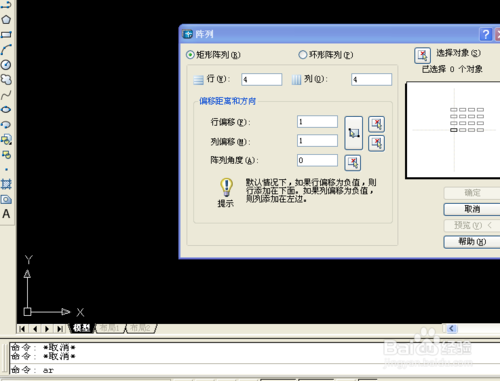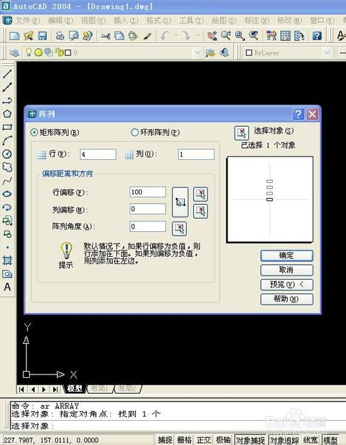 4、现在进行行矩形阵列设置,并点选择对象后选择要阵列的图形。如下图: