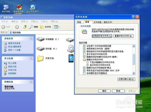 1、这里的介绍都是在Winxp系统下,先设置文件夹选项(显示所有文件):打开“我的电脑”—点击“工具”选项—点击“文件夹选项”—点击“查看”选项—点击右侧拉条并往下拉,找到“显示所有文件和文件夹”,选中它并确定。如果已设置显示所有文件,此步骤可跳过,如右图: