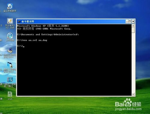 4、将后缀名.sv$改成后缀名.dwg:点击开始—程序—附件—命令提示符—输入cd\回车键(Enter) —输入ren aa.sv$ aa.dwg回车键(Enter) —关闭“命令提示符”对话框,如右图: