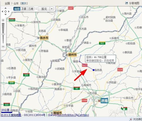 在陵县点一下,在临邑县点一下,记下这个距离:31.3km②(不要看图片上的数值,它包含多余的一段,就是陵县后折出的一段),双击退出测距。