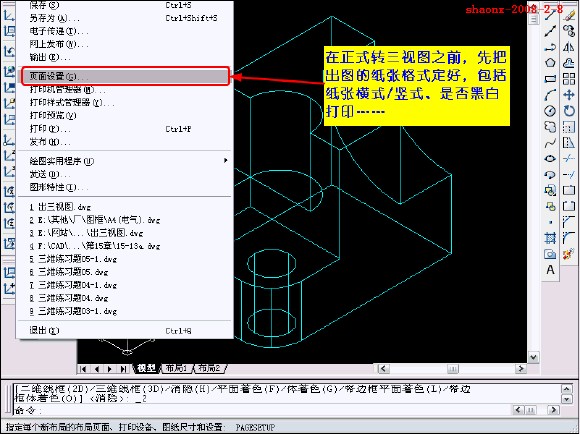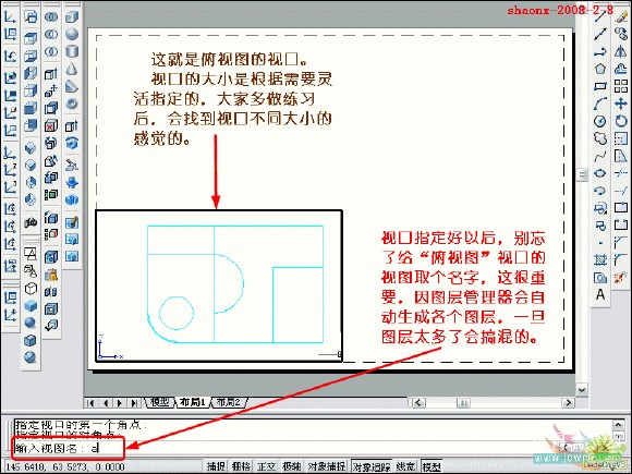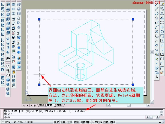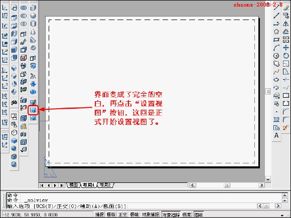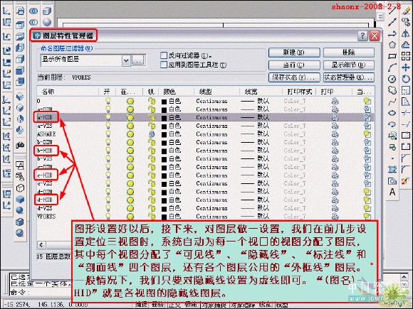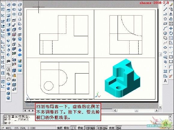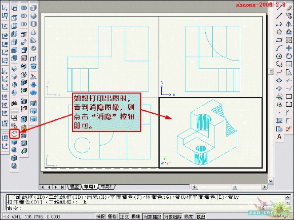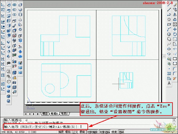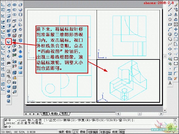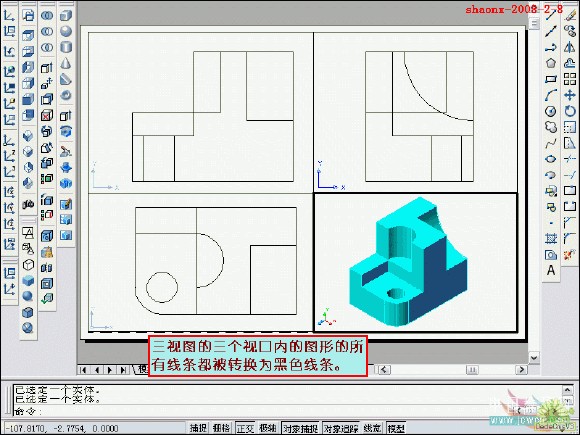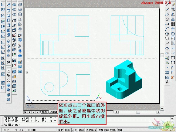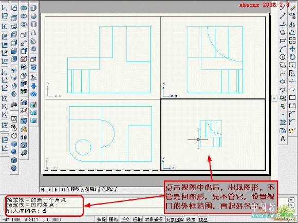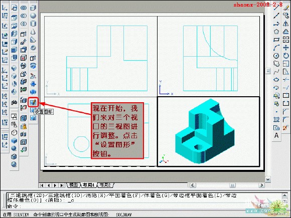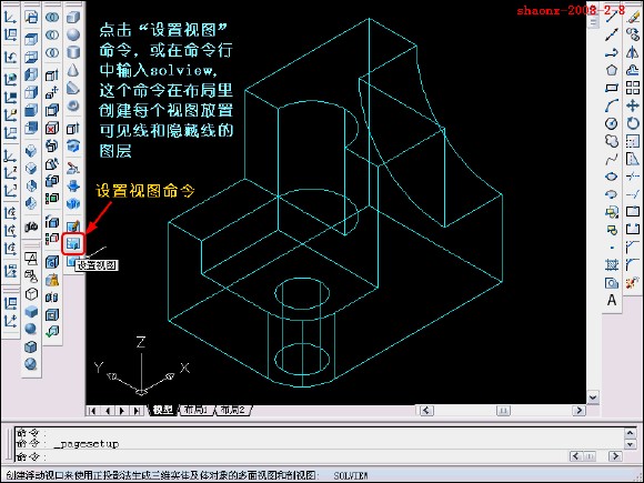 在转换的过程中,要用到2个命令……“设置视图(solview)”、“设置 图形(soldraw)”,这2个命令在CAD的各个版本中都有,是通用的。
