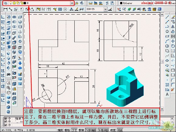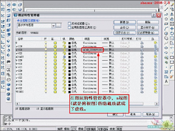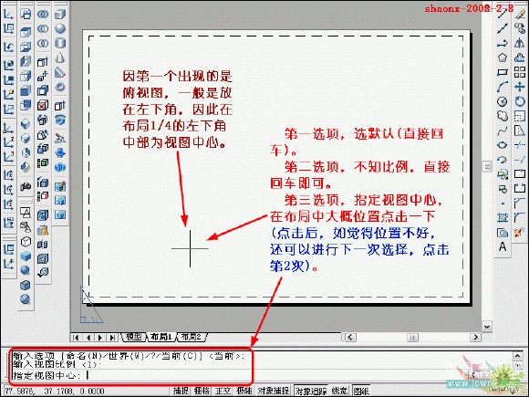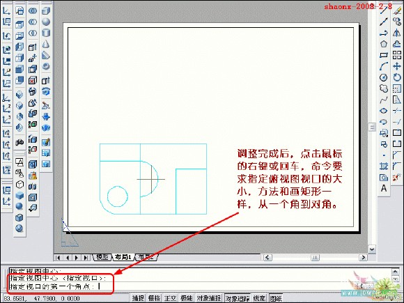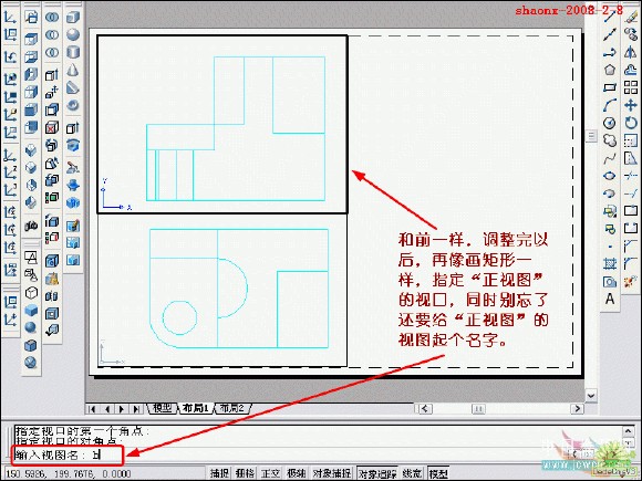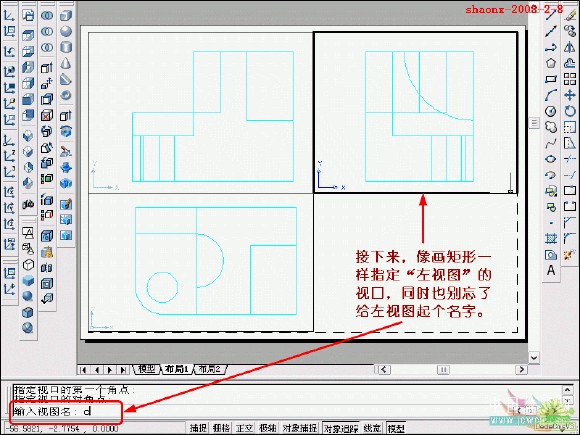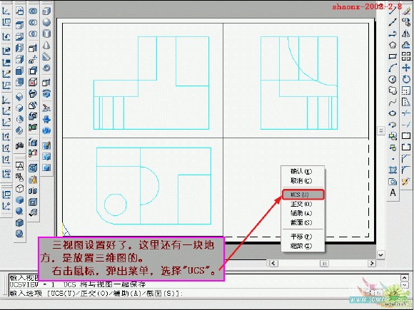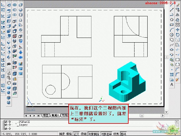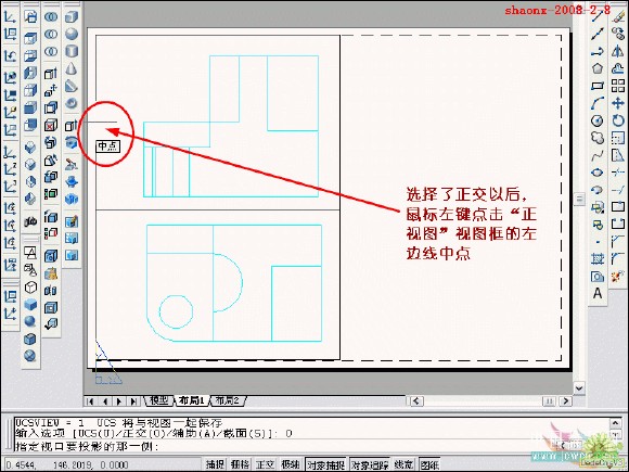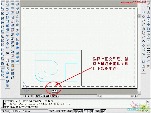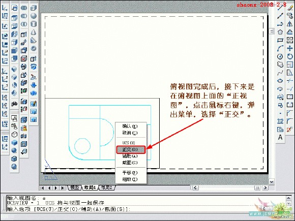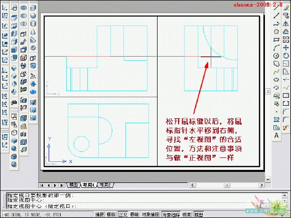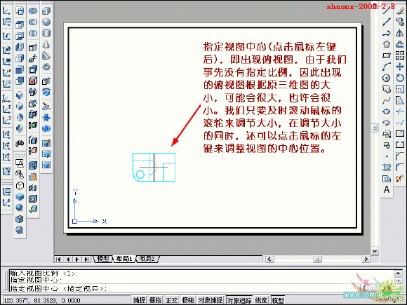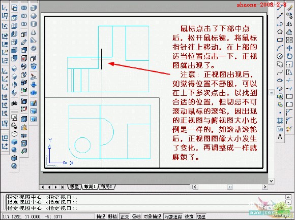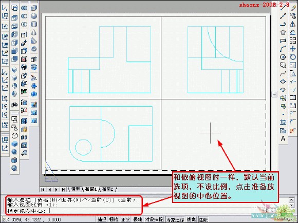 在转换的过程中,要用到2个命令……“设置视图(solview)”、“设置 图形(soldraw)”,这2个命令在CAD的各个版本中都有,是通用的。