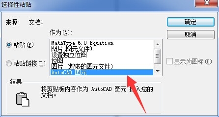 4、在弹出的“选择性粘贴”对话框中选择“AutoCAD图元”,然后点击“确定”: