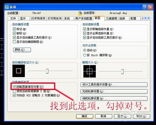 三,如图所示,打开草图,找到忽略图案填充对象,勾掉”对号“。