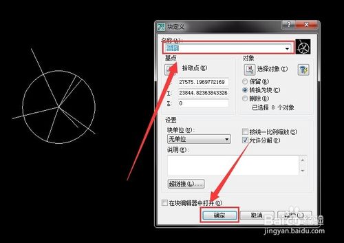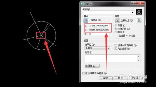 4、会弹出来如图所示的对话框,点击拾取点,(这样创建块的话便于以后的计算或者是复制等等),比如小编点击的是平面树的中心。